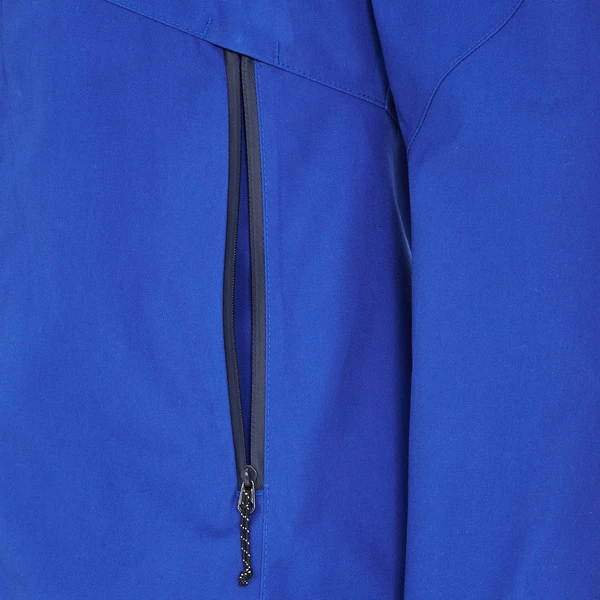 Das robuste Außenmaterial hat einen kräftigen, aber dennoch angenehm weichen Griff. Dadurch fühlt sich die Jacke eher wie eine komfortable Übergangsjacke an als eine Regenjacke. Und dennoch: Das Material ist dank seiner PU-Beschichtung zuverlässig wind- und wasserdicht. Die PFC-freie Imprägnierung verhindert währenddessen, dass Nässe überhaupt erst in das Material eindringen kann.